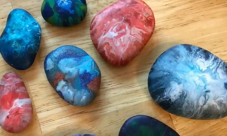 - Aqueça os giz de cera (a supervisão dos pais é recomendada). Existem algumas opções para esta etapa. Uma opção é derreter a pilha inteira como se fosse uma vela e mergulhar a pedra no redemoinho de cor. Se você quiser mais controle do design, escolha a segunda opção. Derreta uma cor de cada vez para criar seu design. Para esta opção use o isqueiro e segure a chama até a ponta do giz de cera. Quando o lápis é macio, você pode usá-lo para desenhar na pedra. Ou aqueça um pouco mais e deixe o giz de cera pingar na rocha como cera.